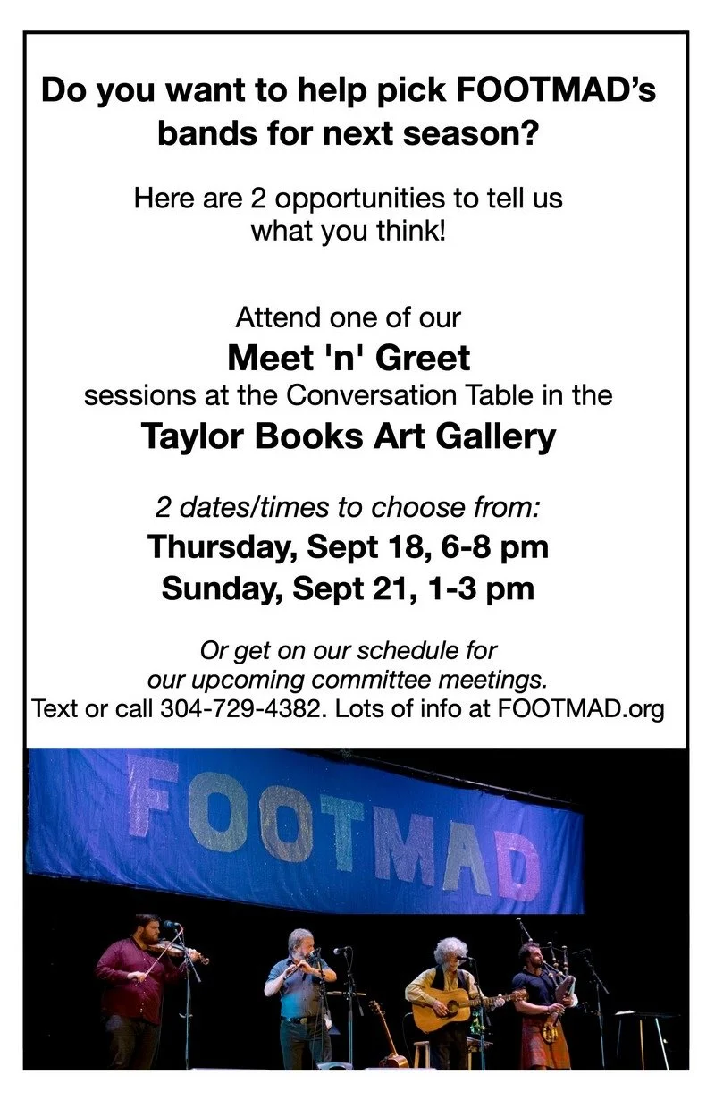 FOOTMAD Meet n Greet Thursday, September 18, 2025 6:00 PM 8:00 PM Taylor Books 226 Capitol Street Charleston, WV, 25301 United States (map) Google Calendar ICS